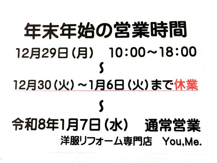 You,Me.の日常 DAYS You,Me.の日常 年末年始の営業時間 2025年から2026年にかけて ちょっと遅くなりましたが、2025年から ...続きを読む 2025年12月18日 / You,Me.の日常, お知らせ 修繕工事中ですが、通常営業しております 現在当店は建物の修繕工事の為、足場が組 ...続きを読む 2025年11月9日 / You,Me.の日常, お知らせ 9月27日(土)の『しばたマルシェ』に出店します! 久々のイベント出店です! 9月27日( ...続きを読む 2025年9月10日 / You,Me.の日常, お知らせ, イベント情報 お盆期間中は休日営業時間で営業しております! 今年は、一週間休日営業時間となり、17: ...続きを読む 2025年8月7日 / You,Me.の日常, お知らせ 2025年もアルビうちわを作りました! 今年もサッカー、アルビレックス新潟の当店 ...続きを読む 2025年7月9日 / You,Me.の日常, お知らせ 日本人って黒い服が好きな方が多くないですか? タイトル通りの内容ですが、世間では黒い ...続きを読む 2025年6月26日 / You,Me.の日常, お知らせ 販売スペースにメンズ服が新入荷! 店内にある販売スペースに、新しい洋服を並 ...続きを読む 2025年4月28日 / You,Me.の日常, お知らせ, 店頭限定商品 2024年~2025年の年末年始の営業時間 2024年から2025年にかけての年末年 ...続きを読む 2024年12月25日 / You,Me.の日常, お知らせ 愚直なまでの「辛抱」-上手くなる為に必要な事- この前ストーブを片付けたような気がします ...続きを読む 2024年12月1日 / You,Me.の日常, お知らせ 当店はどんな店?洋服リフォーム専門店You,Me.はこんな店です! 先日、お客様から「そちらの店は業者の方 ...続きを読む 2024年10月19日 / You,Me.の日常, お知らせ お盆期間中の時短営業について 今年のお盆期間中の営業時間についてお知 ...続きを読む 2024年7月25日 / You,Me.の日常, お知らせ 今年はうちわを作りました 去年はのぼり旗を作りましたが、今年はアル ...続きを読む 2024年6月28日 / You,Me.の日常, お知らせ 1 2 3 … 9 ›